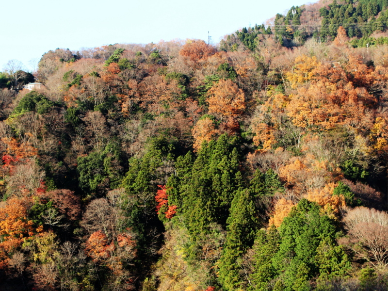 虽然从芦之湖天际线公路上无法看到红叶,不过在返回小田原时,宫之下地区看到了一大片红叶,十分美丽。在河附近停车后,从桥上能拍到绚烂的红叶美景。